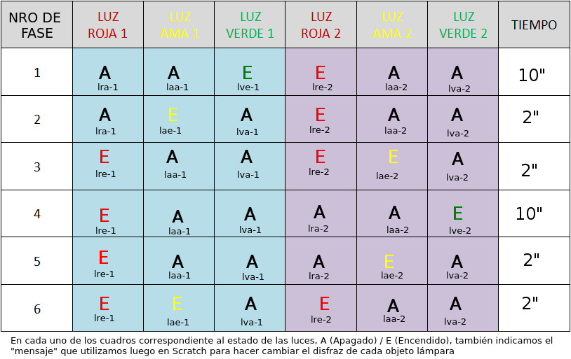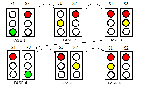 1) Costruimos un diagrama del funcionamiento de ambos semáforos durante todas sus fases (6)
